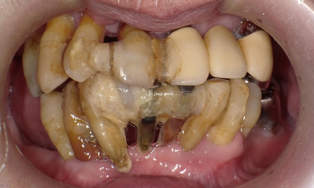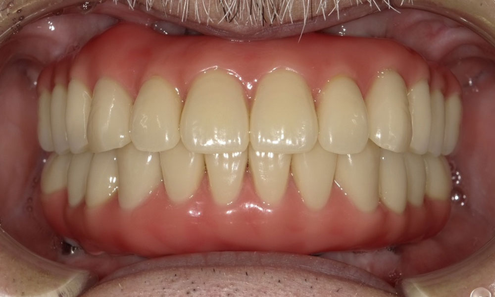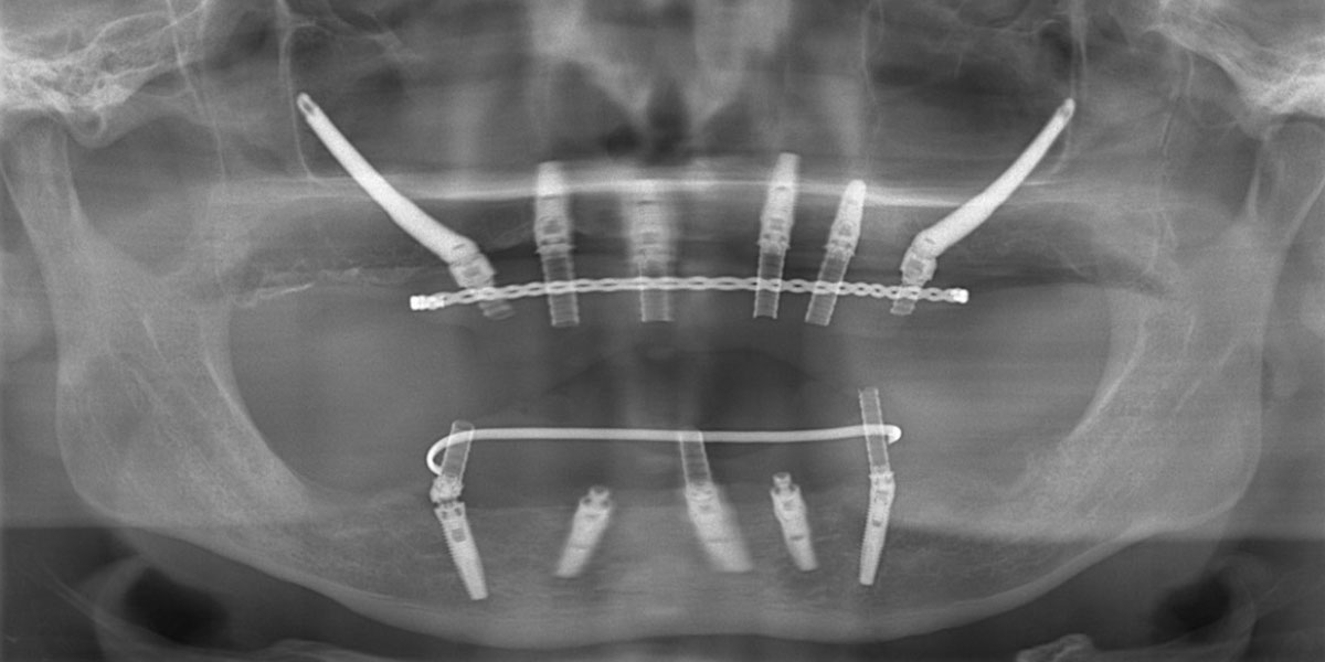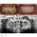 全体的に歯がボロボロで噛むと痛みがあると訴えあり。インプラント埋入可能な歯槽骨量が少なく、残存歯も抜歯対象のため上下ザイゴマインプラント治療を選択。